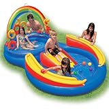 Enjoy summer with this Intex Rainbow Ring Play Center inflatable pool. It includes a water slide, wading pool, water sprayer, ring toss game with four inflatable rings, and a ball roller game and toss ball game six 3-1/8"8cm and plastic play balls are included. The water sprayer attaches to a garden hose to keep kids cool in the summer.  Wading pool fills to 80% of wall height: 65 gallons, 246 L. It includes the repair patch.